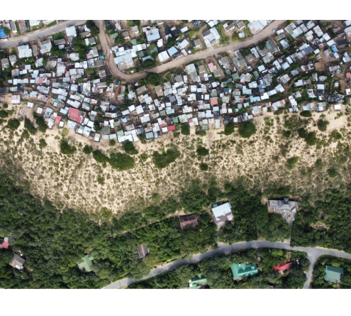 The picture, taken by a drone, has captured the image of clusters of informal homes perched, seemingly, on the very edge of the dune between Groenvallei and Smutsville. The bulk of the area in question is Erf 5046, belonging to Knysna Municipality, with a smaller portion being Erf 2794, belonging to Landjong Beleggings Pty. Ltd. We sent the photograph to the local authorities asking what the long-term plan is concerning safety measures.